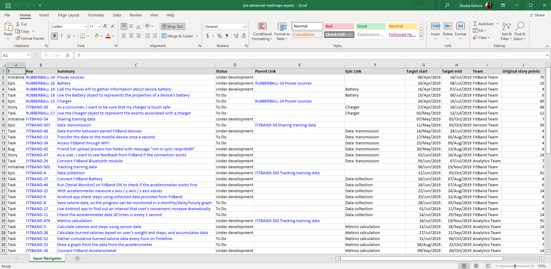 This sample is the Excel export of a plan built with Advanced Roadmaps for Jira, including Initiative, Story and Task type work items (issues). It is exported from the Issue Navigator using a custom column configuration, which includes all Advanced Roadmaps-managed custom fields plus Epic Link.