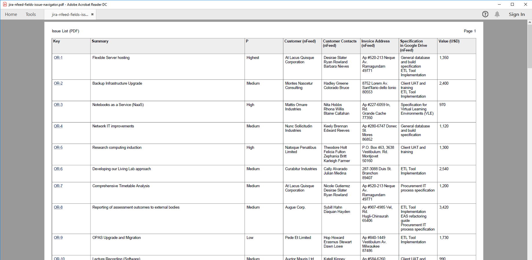 Elements Connect custom fields are also supported when bulk-exporting Jira issues to a table. Note: Elements Connect fields are so transparent in the PDF document that the "(nFeed)" ending was added to the field names to mark those.
