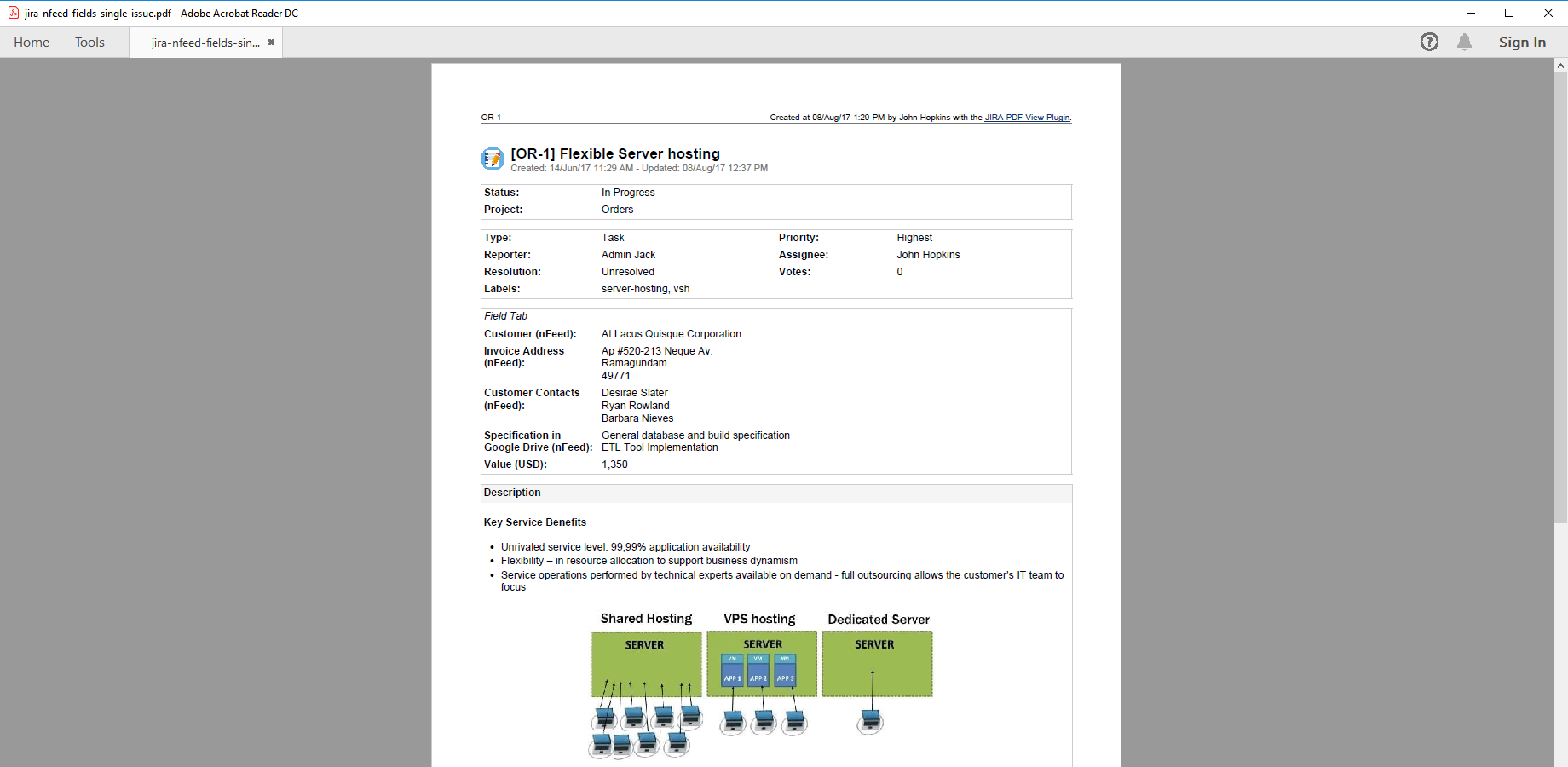 This sample PDF export (generated from the issue-fo.vm template) contains a single Jira issue with several Elements Connect custom fields: one of them is a Google Drive document selector, while customers, invoice address and contacts are dependent fields loaded from an external CRM database.
